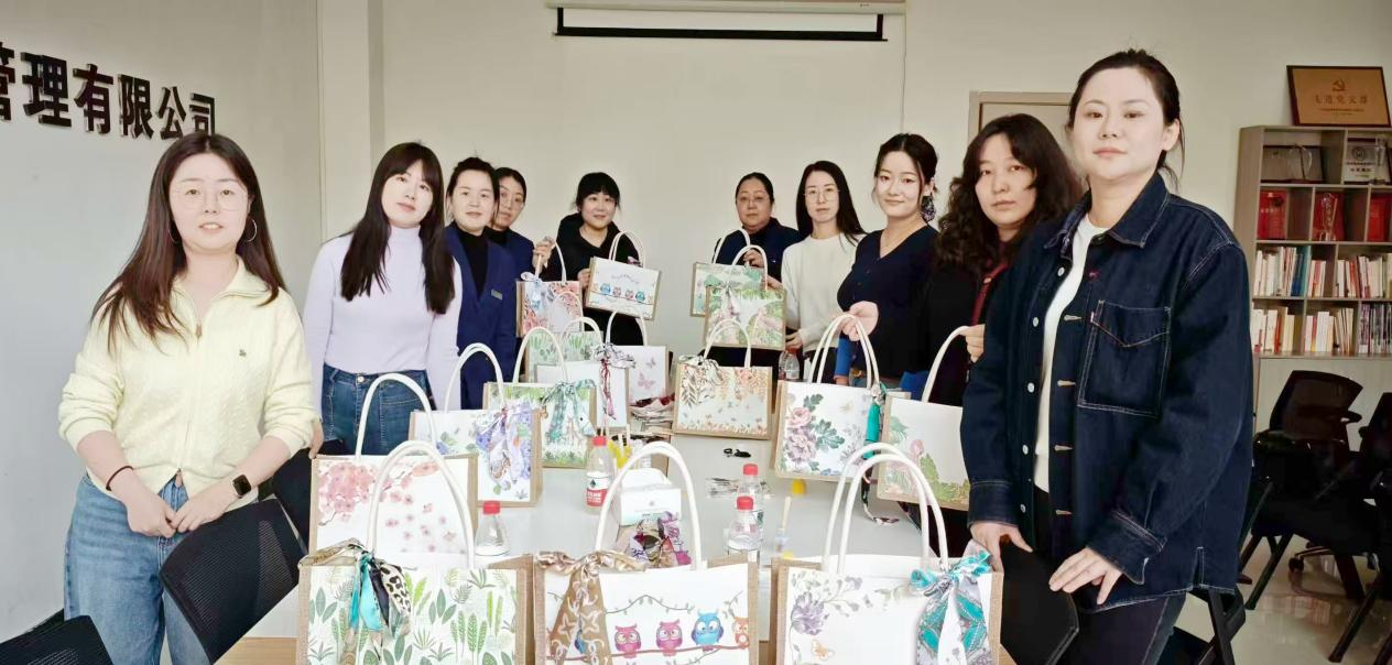 物业公司提前准备了素色麻布包、防水胶、剪刀、复古花纹布料及装饰配件,并推送学习视频。女职工们围坐在一起,先根据自己的喜好挑选花纹布料,将其裁剪成合适的形状,再用防水胶仔细粘贴在麻布包表面,有的搭配复古碎花图案,有的拼接几何线条,还有的点缀小珍珠和丝带,每个人都专注地设计着属于自己的独特包袋。