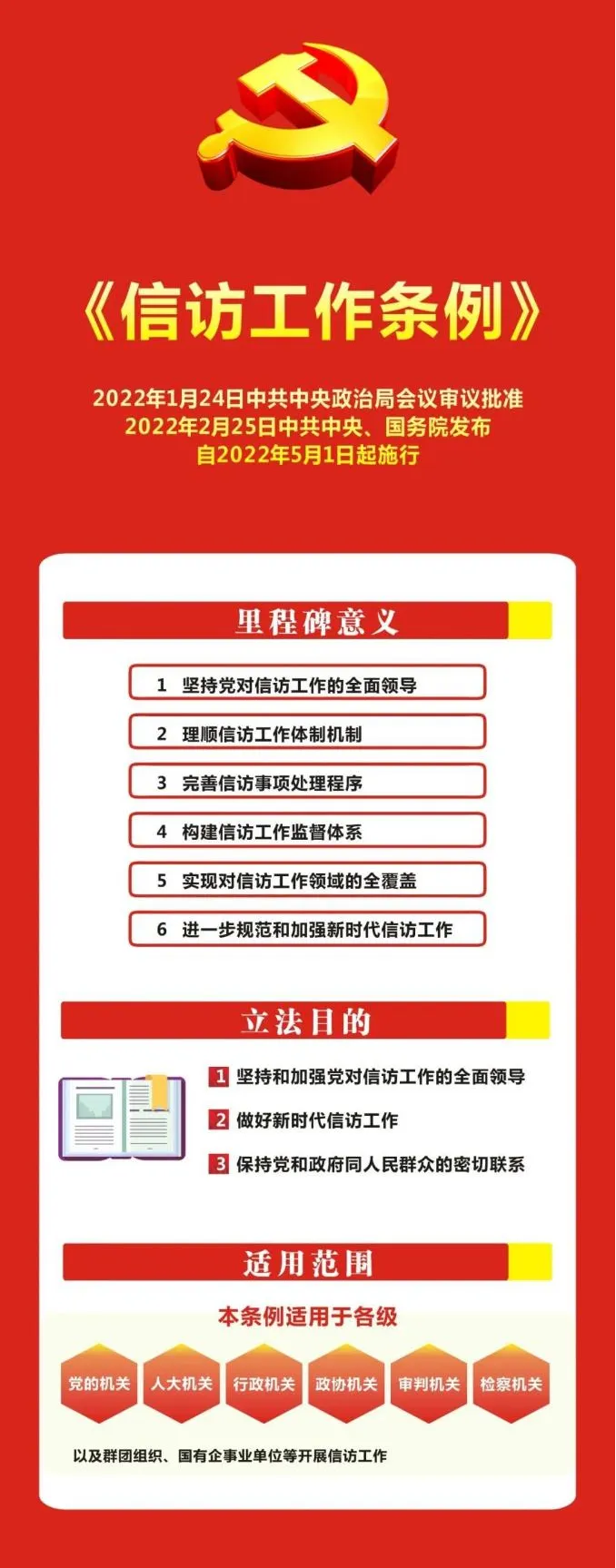 答:《条例》适用于各级党的机关、人大机关、行政机关、政协机关、监察机关、审判机关、检察机关,以及群团组织、国有企事业单位等开展信访工作。公民、法人或者其他组织通过信访渠道,向上述各级机关、单位反映情况,提出建议、意见或者投诉请求等,应当符合《条例》规定要求。